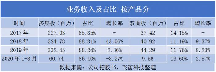 双面板2018年的收入较上年增长了9.37%,主要是随着信丰生产基地不断增加机器设备投入并逐步改进生产管理,且下游电子信息行业需求旺盛,带动收入增长。2019年,双面板收入较上年增长8.23%,主要是向安防电子类客户如大华股份、锐明技术双面板销量大幅上升,2020年1-3月,由于医疗器械领域订单需求上升,带动双面板收增长2.57%。
