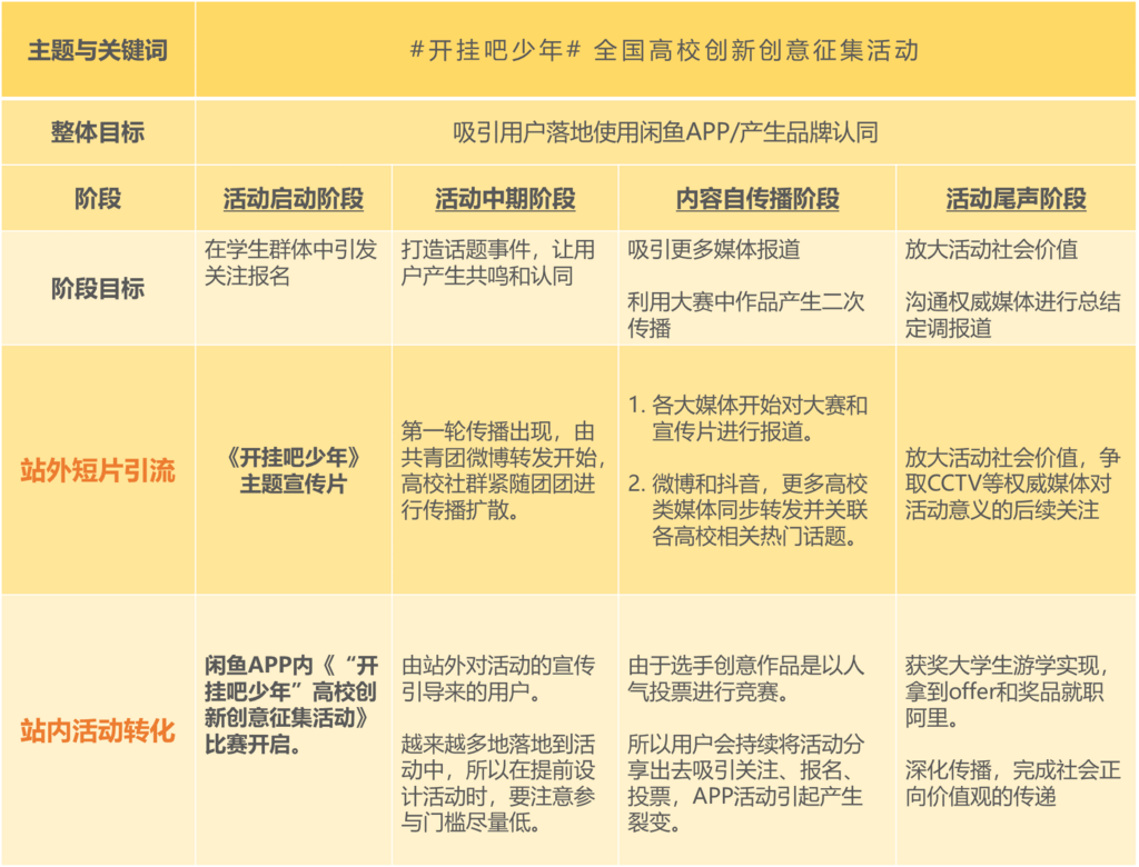从图中不难看出,闲鱼打造《开挂吧少年》活动的主要部分并不复杂,是一个典型的利用 站外引流+站内活动 两部分组成的活动。
