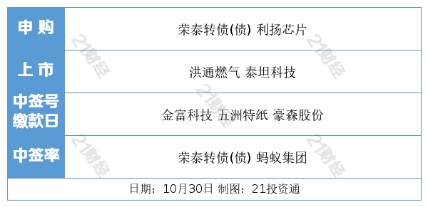 6、中金公司:将于11月2日在上交所上市,共发行4.59亿股,发行价为28.78元,募资总额为131.98亿元;本次发行战略配售最终发行股票数量为1.38亿股,网下发行最终股票数量为8675.93万股,网上发行最终发行股票数量为2.34亿股。