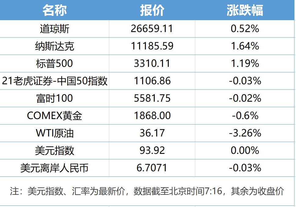 美股三大股指全线收涨。道指收涨0.52%,纳指收涨1.64%,标普500指数收涨1.2%。科技股、新能源汽车板块表现强势,苹果涨超3.7%,高通涨4%,脸书涨近5%,推特大涨8%;中概股蔚来汽车涨逾16%。能源、航空和疫苗板块全数反弹,埃克森美孚涨超4%,Moderna涨近9%。21老虎证劵-中国50指数跌0.03%。
