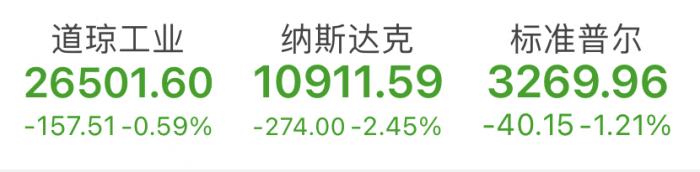 美国东部时间10月30日,受美国疫情形势严峻以及明星科技巨头业绩前瞻指引疲软影响,三大股指集体收跌。截至收盘,道琼斯工业平均指数跌0.59%,报26501.60点;纳斯达克综合指数跌2.45%,报10911.59点;标普500指数跌1.21%,报3269.96点。