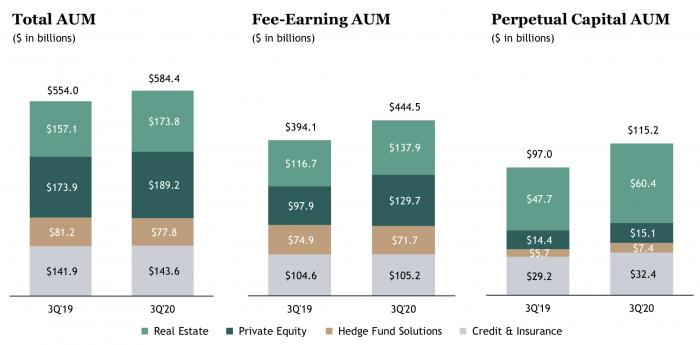 2020年第三季度黑石集团总资产管理规模 (AUM)为5844亿美元,同比增长5%。其中,不动产三季度AUM为1738亿美元,同比上升11%;私募股权三季度AUM达1893亿美元,同比增加9%。