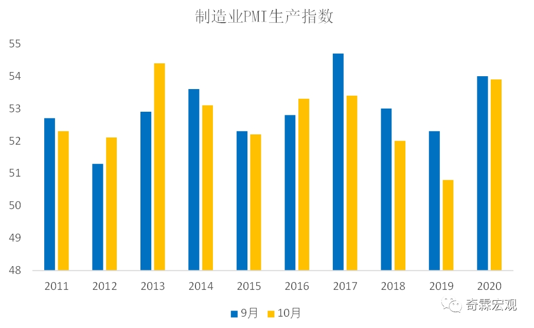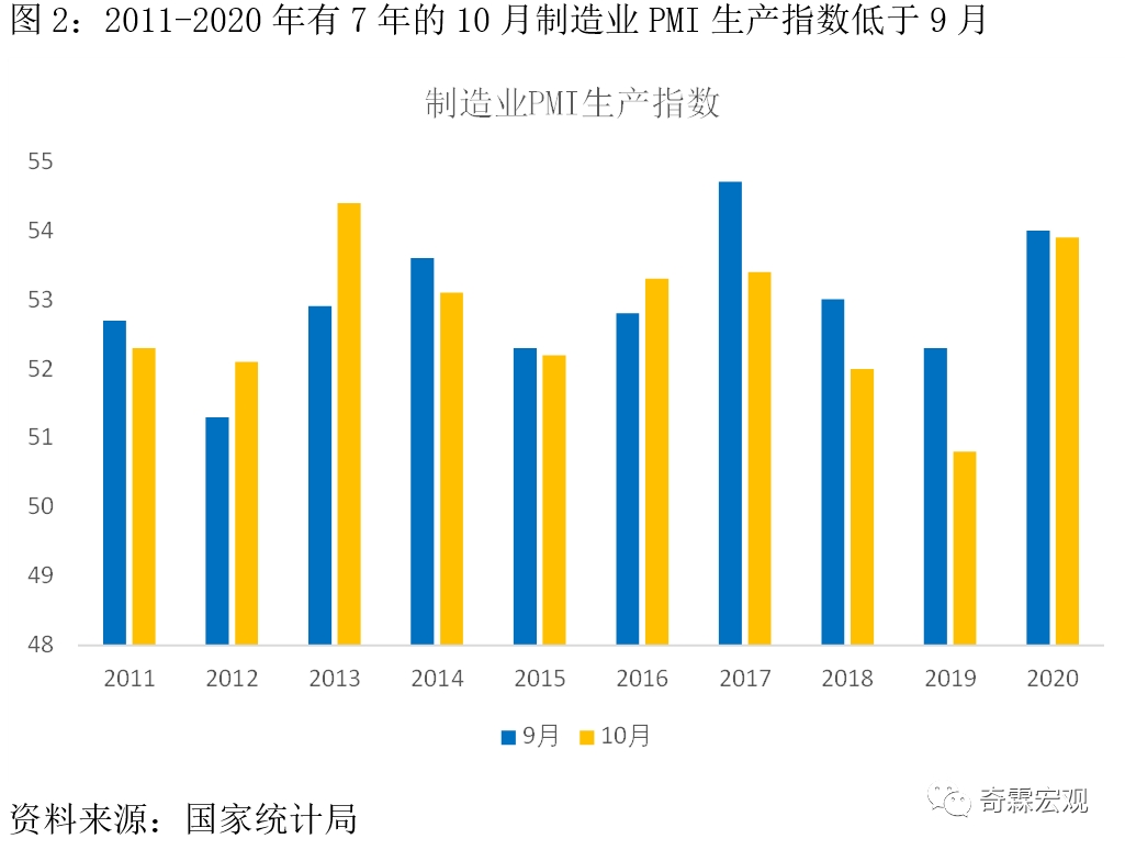 2011-2020这10年有7年的10月PMI生产指数和9月相比是下降的。过去9年制造业PMI生产指数9月和10月的均值分别为52.8%、52.6%,环比下降0.2%,和今年环比下降0.1%接近,因此生产下降能够用季节性规律来解释。
