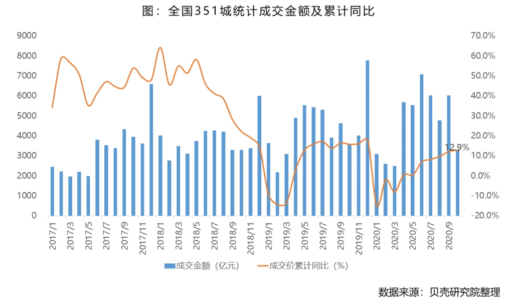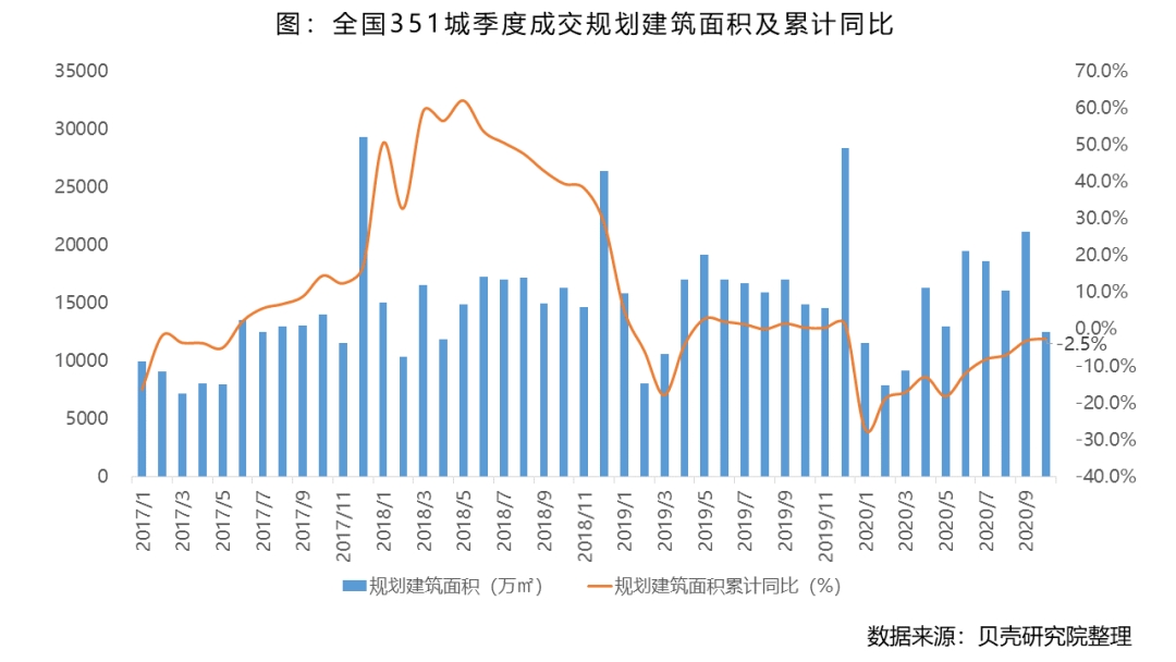 贝壳研究院统计整理数据显示,2020年10月(截止10月27日),全国351城整体住宅用地累计成交金额达4.6万亿元,累计同比增长12.9%。全国351城整体住宅用地累计成交规划建筑面积14.6亿㎡,累计同比降幅收窄0.6个百分点至2.5%。10月28日至10月31日,计划出让6734万㎡以上,如果顺利成交,据贝壳研究院测算,全国351城整体住宅用地成交规划建筑面积累计同将进入增长区间,增长幅度0.1%,市场追平去年同期。从目前的各城市出让计划统计可知,11月预计出让规划建筑面积1.7亿㎡的住宅用地,如果全部成交,11月的住宅用地规划建筑面积累计同比将增长1.2%。
