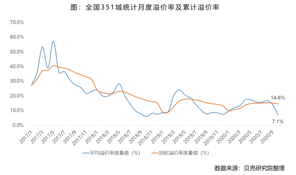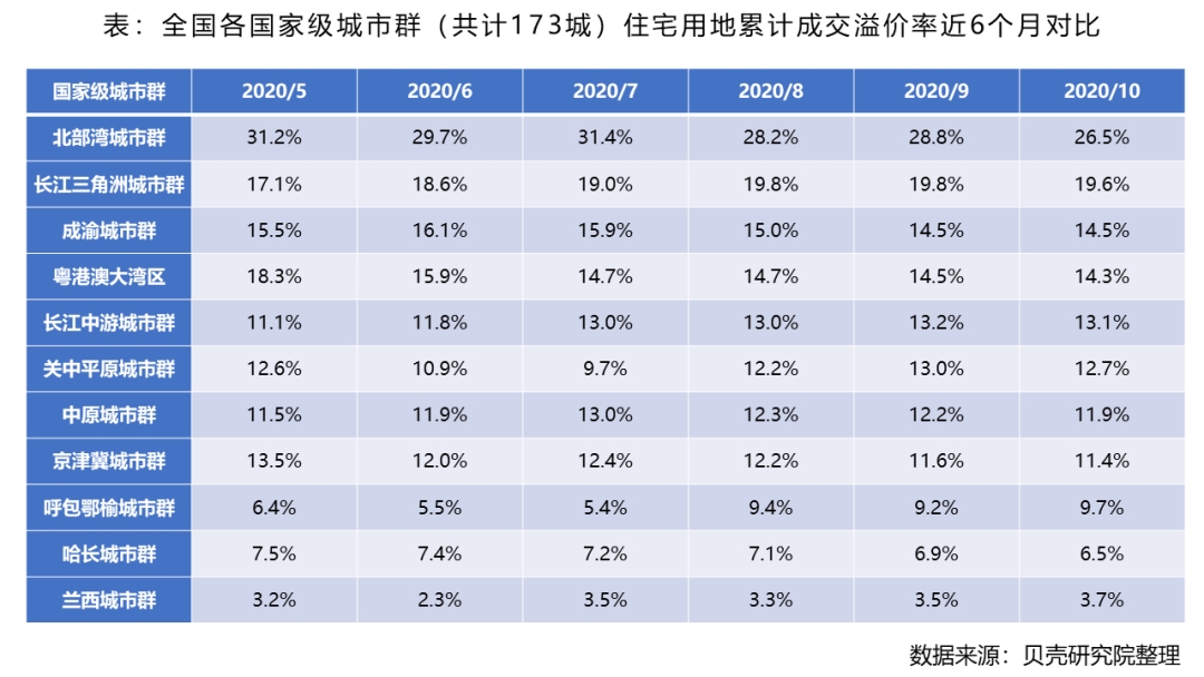 2020年1-10月(截止10月27日),全国351城整体住宅用地累计成交溢价率从5月起开始稳定在15%的水平,基本与2019年同期持平,市场保持较好的活跃度。但10月起,随着多数城市调控,预期下调,单月溢价率控制到2020年全年最低值,调控威力在住宅用地市场得到体现。