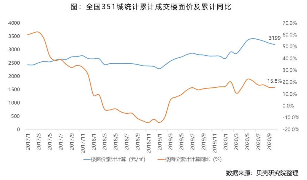 2020年1-10月(截止10月27日),全国351城整体住宅用地累计成交楼面价同比增长15.8%,环比上月持平,各城市控制地价稳定,回调市场价格增长预期。预计在稳地价政策目标下,年内累计成交楼面价持续稳中有降。