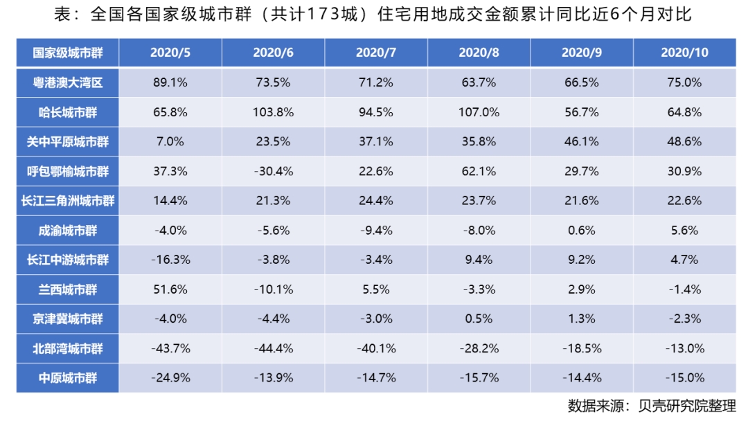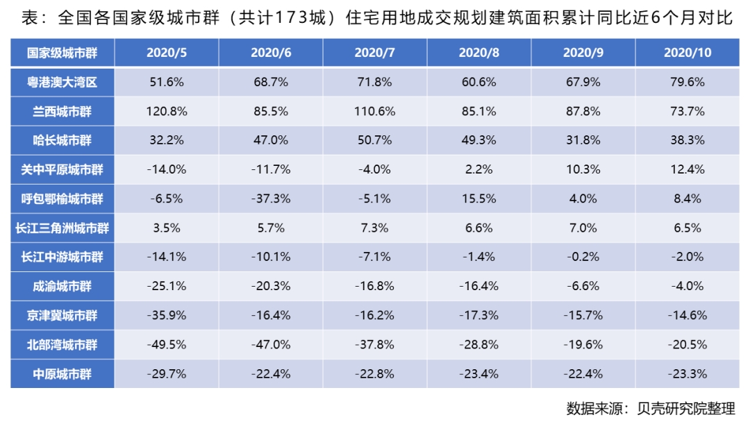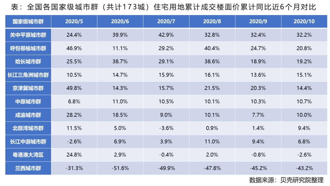 2020年1-10月,粤港澳、哈长城市群成交量累计同比表现突出,城市群住宅用地成交金额及规划建筑面积累计同比收窄之后,10月略有反弹。其中粤港澳大湾区成交金额累计同比、成交规划建筑面积累计同比均排在第一位,随着广州、东莞、佛山、深圳等城市加大供应,住宅用地市场热度较高。长江三角洲城市群住宅用地成交金额及规划建筑面积累计同比则保持稳定,其中住宅用地成交金额累计同比持续5个月保持20%以上增速,规划建筑面积累计同比持续4个月保持6%以上增速。另外,成渝城市群住宅用地成交金额累计同比增速环比9月增加5个百分点。