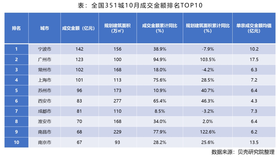 10月,宁波、广州、常州、上海成交金额排名前4位,单月成交金额突破百亿
