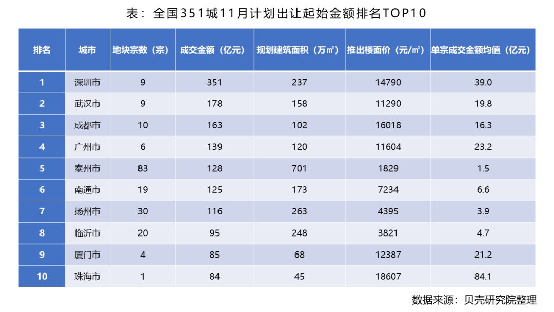 11月,深圳计划推出住宅用地规划建筑面积与1-10月已成交面积基本持平,可见用地审批权下放深圳后,释放利好信息,深圳对于住宅市场预期以及信心回升,用地供应灵活性增强。其中11月23日,集中供应8宗地块,起始金额达294亿元,其中宝安区1宗地规划建面131万㎡,起始金额127亿元,该规模为2020年全国351城成交宅地中第三位,深圳住宅用地供应加大。