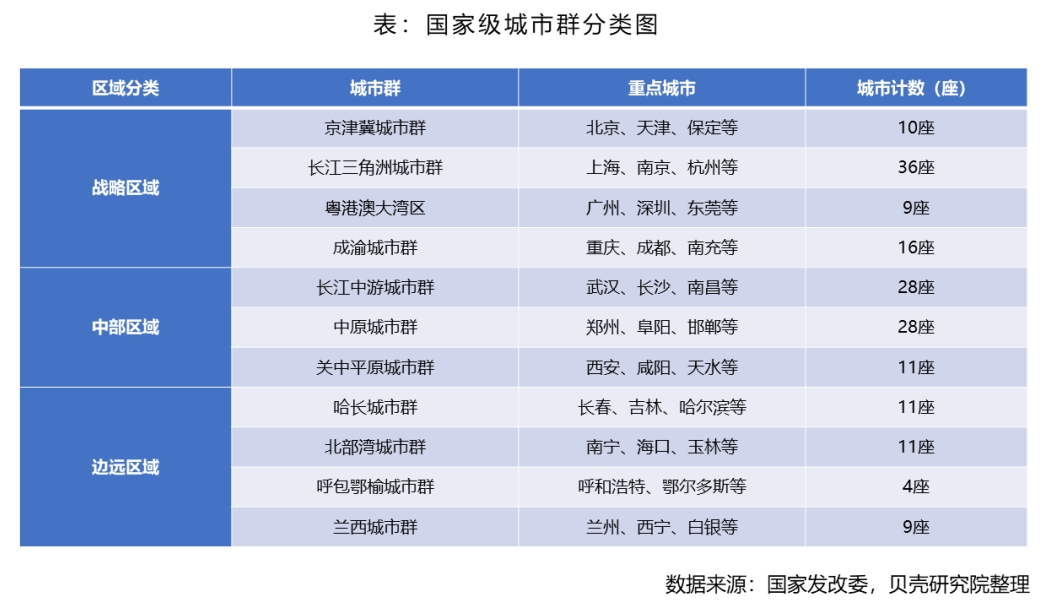 根据国家发改委发布的各国家级城市群规划以及国务院对各规划的批复,以及各规划中涉及城市汇总后,基本分为京津冀城市群、长江三角洲城市群、粤港澳大湾区、成渝城市群、长江中游城市群、中原城市群、关中平原城市群、哈长城市群、北部湾城市群、呼包鄂榆城市群、兰西城市群。根据城市群特点,贝壳研究院将国家级城市群根据战略及地域特征分为战略区域、中部区域、边远区域等三大类。具体划分如下:
