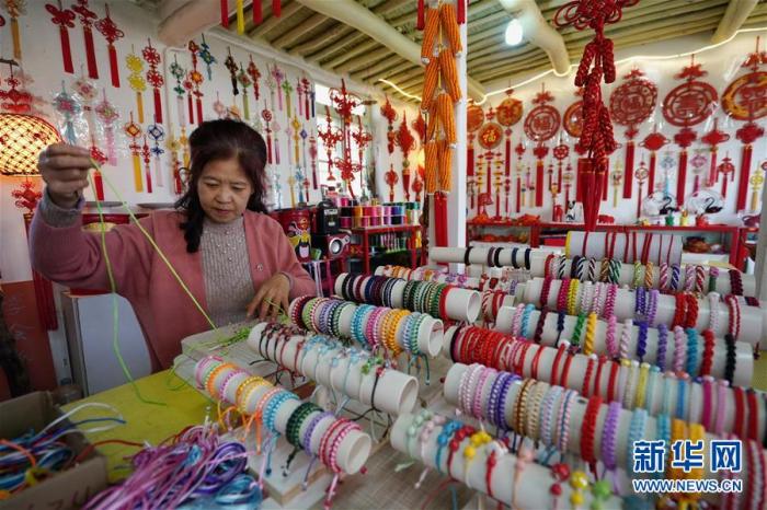 河北省秦皇岛市北戴河区北戴河村中国结艺术馆的工作人员在编中国结(10月28日摄)。新华社记者 杨世尧 摄