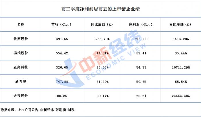 上市猪企三季报已悉数出炉。中新经纬客户端注意到,从净利润上看,牧原股份、温氏股份、正邦科技、新希望、天邦股份仍是A股排名前五的上市猪企,1-9月净利润合计达425.71亿元,去年同期为106.06亿元,增超3倍。