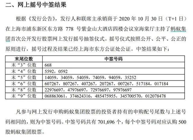 根据蚂蚁官方数据,此次中签号码共有701696个,每个中签号码对应认购500股蚂蚁集团股票。