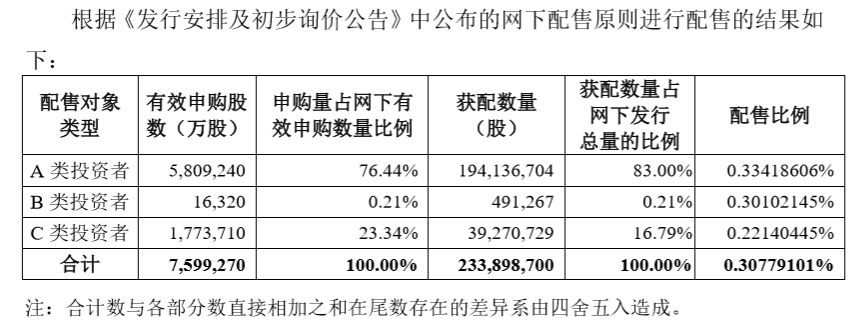 根据网下配售结果,A类投资者获配最多,获配1.94亿股,占蚂蚁网下发行总量的83%,配售比例为0.3342%。B类投资者获配49.13万股,占蚂蚁网下发行总量的0.21%,配售比例为0.3010%。C类投资者获配3927.07万股,占蚂蚁网下发行总量的16.79%,配售比例为0.2214%。
