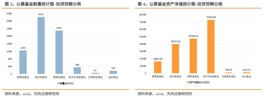 截至2020年三季度末,公募基金数量为7104只基金,累计资产净值合计178013.73亿元。根据投资范畴分类,全部基金中,混合型基金数量最多,达到3011只;货币市场型基金资产净值最高,为72826.89亿元。