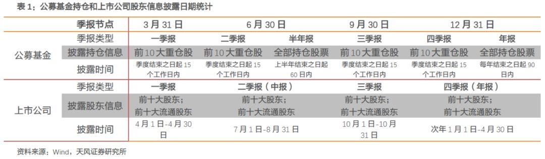 然而,公募基金仅会在季报中披露持仓信息,且在一季报和三季报中只披露部分十大重仓股信息。与上市公司季报披露的时间不同,公募基金会在每个季度结束的15个工作日内披露季报,我们可以获取基金的前十大重仓股信息;而在二季报和四季报之后还会披露半年报和年报,我们可以获取基金的全部持仓股信息。可以发现,基金季报存在披露持仓信息不完整、时间滞后等问题。