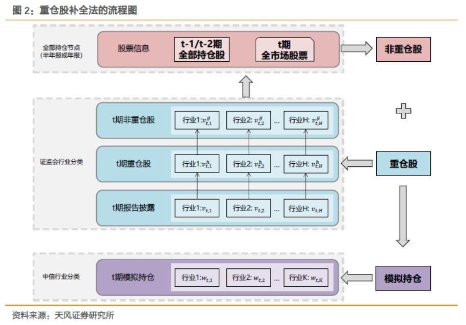 具体的,重仓股补全法,即在证监会行业配置约束下,利用上期持仓股票和全市场其他股票补全本期行业配置缺失的部分,模拟本期全部持仓,进而估计基金的中信行业配置信息。其前提假设条件为基金经理配置偏好具有延续性,其管理的基金在前后期非重仓股的行业配置比例不变。