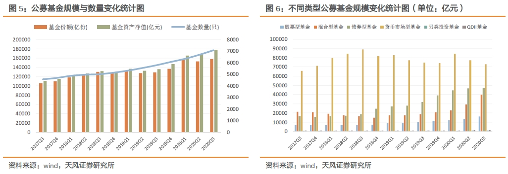 截至2020年三季度末,基金数量较上季度增加了396只,规模增加了9455.46亿元。混合型基金规模较上季环比增速最高,为36.27%;股票型基金和混合型基金分别增加2579.37亿元和10582.21亿元。可以发现,2019年以来权益类基金规模持续扩张,备受市场关注;货币型基金的规模再次下滑。