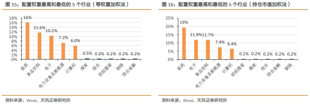 在板块配置方面,板块配置权重较为集中,消费、TMT和中游制造等板块备受偏爱。中游制造和消费等板块加仓幅度明显,等权重加权法下中游制造加仓2.0%至23.1%,消费加仓1.8%至36.2%;持仓市值加权法下中游制造加仓3.1%至22.1%,消费加仓1.2%至40.3%。而TMT等板块减仓幅度明显,等权重加权法下减仓3.3%至21.5%,持仓市值加权法下减仓4.6%至24.2%;上游原材料、基础设施建设及运营、金融地产等板块的也存在较小幅度的加减仓。