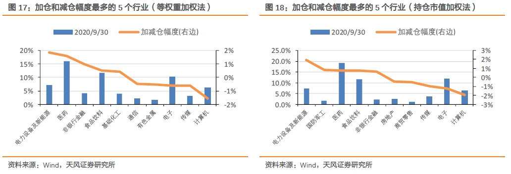 上图中绘制了等权重加权法和持仓市值加权法下,2020Q3与2020Q2主动权益类基金的行业配置比例。可以发现,行业配置权重较为分散化,仅医药、食品饮料、电子、电力设备及新能源、计算机等行业的权重超过了5%。同时,部分行业配置权重比上期变动较大,如电力设备新能源、医药等加仓幅度超过了1%,而计算机、电子等减仓在1%以上。