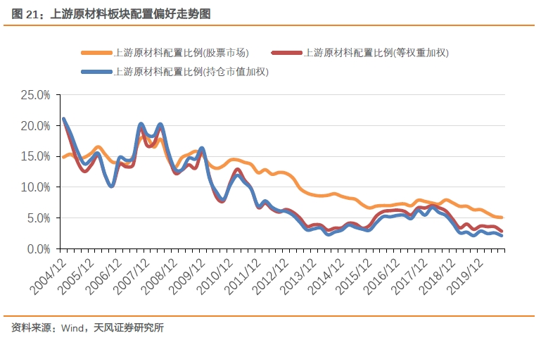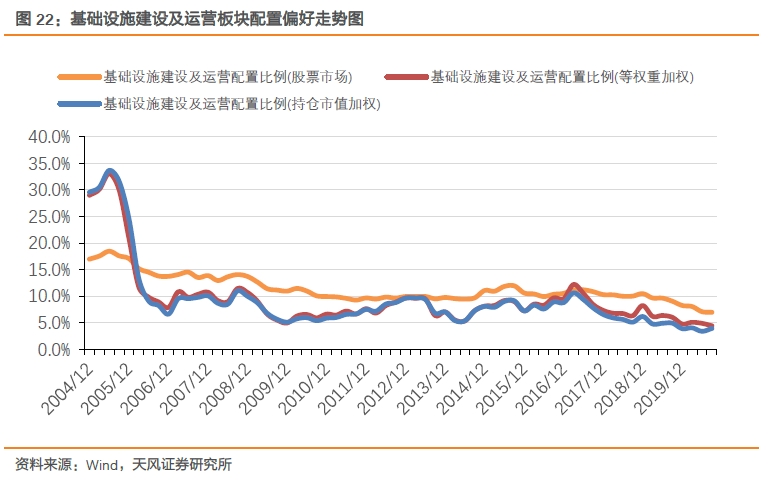 最后,我们分析了各板块的配置偏好演变过程,同时引入全市场所有股票在各板块的配置比例,结果如下面各图所示。可以发现,上游原材料、基础设施建设及运营、金融地产等板块处于低配位置,消费、TMT等板块处于超配位置。其中,近年来,中游制造、消费等板块处于加仓趋势,而上游原材料、基础设施建设及运营、金融地产、TMT等板块处于减仓趋势。