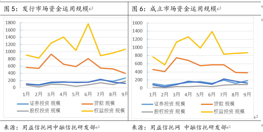 从9月信托行业的资金运用方式来看,证券类信托成立规模增长显著,贷款类信托持续走低,权益投资类信托规模占比过半。