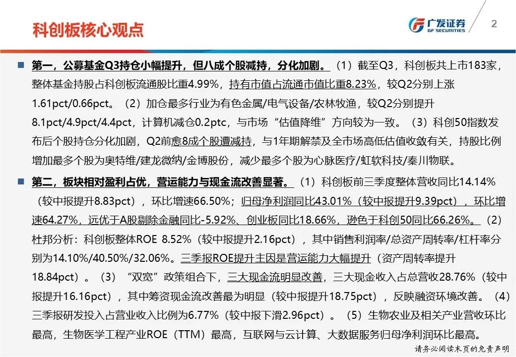 第二,板块相对盈利占优,营运能力与现金流改善显著。(1)科创板前三季度整体营收同比14.14%(较中报提升8.83pct),环比增速66.50%;归母净利润同比43.01%(较中报提升9.39pct),环比增速64.27%,远优于A股剔除金融同比-5.92%、创业板同比18.66%,逊色于科创50同比66.26%。(2)杜邦分析:科创板整体ROE 8.52%(较中报提升2.16pct),其中销售利润率/总资产周转率/杠杆率分别为14.10%/40.50%/32.06%。三季报ROE提升主因是营运能力大幅提升(资产周转率提升18.84pct)。(3)“双宽”政策组合下,三大现金流明显改善,三大现金收入占总营收28.76%(较中报提升16.16pct),其中筹资现金流改善最为明显(较中报提升18.75pct),反映融资环境改善。(4)三季报研发投入占营业收入比例为6.77%(较中报下滑2.96pct)。(5)生物农业及相关产业营收环比最高,生物医学工程产业ROE(TTM)最高,互联网与云计算、大数据服务归母净利润环比最高。