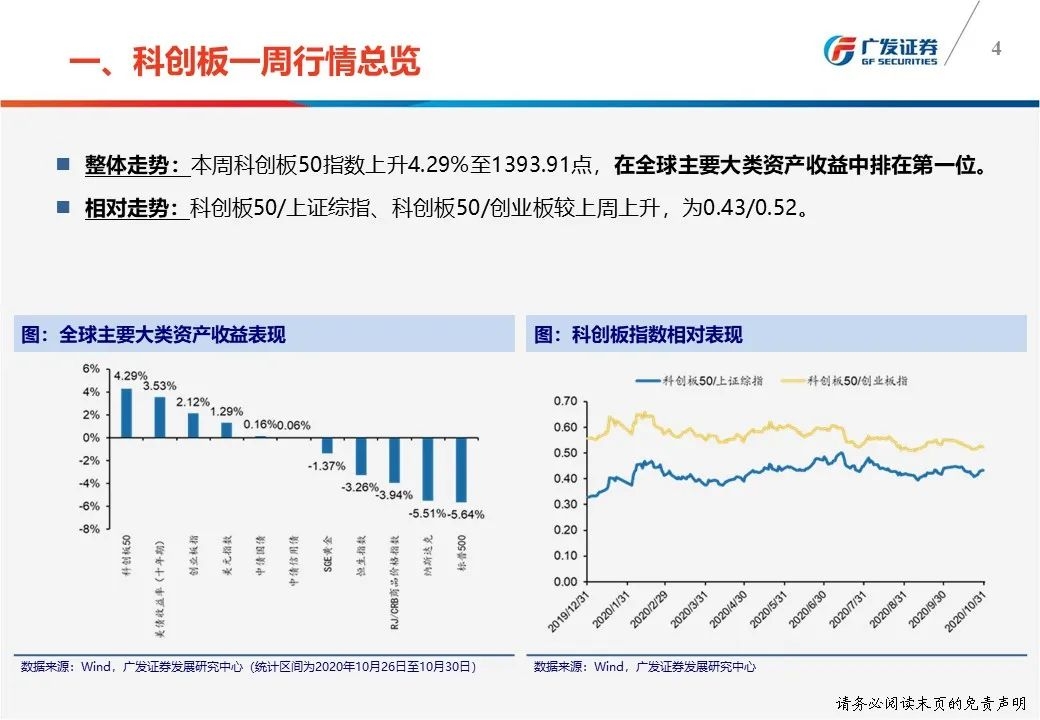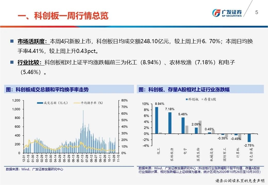 一周行情总览:(1)科创板50指数本周上升4.29%至1393.91点;(2)本周日均成交额248.10亿元,较上周上升6.70%;本周日均换手率4.41%,较上周上升0.43pct。