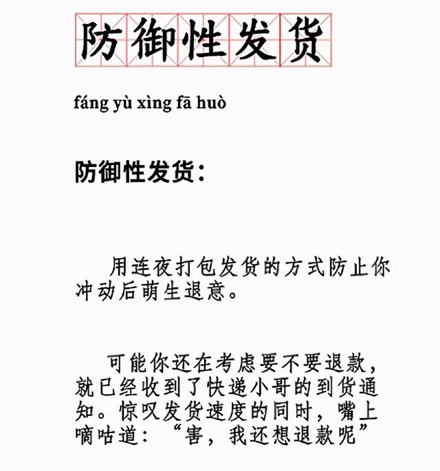 所以事实就是,尽管在历年身经百战,但我们又没能保持住打工人的气节,以至于从牛气的定金人沦为了卑微的尾款人。在大潮的裹挟之下,我们很容易在头脑发热的时候买没用的东西,事后想要退货,然而商家还有“防御性发货”的招数。