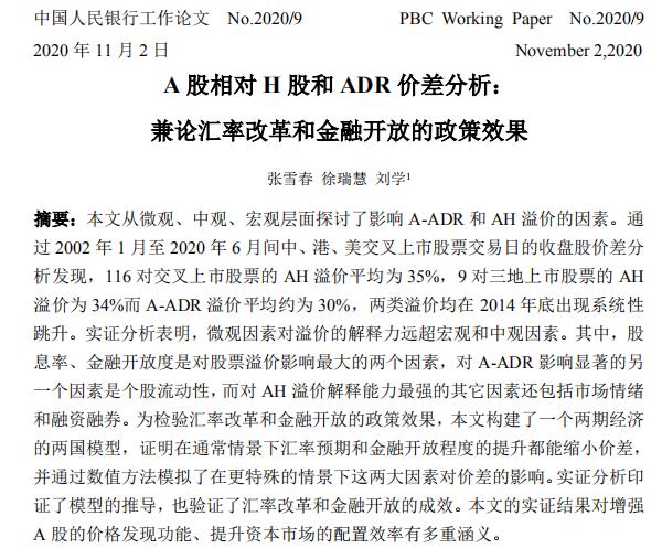 11月2日,中国人民银行发布工作论文,《A股相对H股和ADR价差分析:兼论汇率改革和金融开放的政策效果》。论文通过对比 A 股、H 股及 ADR 之间个股溢价率,发现 H 股和 ADR 之间价差极低,显示香港和美国市场高度融合,而 A 股相对于 H 股和 ADR 存在显著溢价,说明内地与境外市场存在分割。市场分割通过宏观、中观、微观层面多类因素影响了投资者的估值,进而影响了 AH 和 A-ADR 溢价。这些因素包括宏观层面的预期汇率变动和市场开放程度,中观层面的市场情绪,以及微观层面的股息率、流动性不足、投机动机、信息不对称等,其中,微观因素的重要性大于中观和宏观因素的重要性。值得关注的还包括以下几方面,一是个股股息率在所有溢价分析结果中基本都是决定性因素,主要原因是国际投资者最重视的基本面因素。二是市场情绪在解释 AH 溢价率中的重要程度强于 A-ADR 溢价率,可能反映了 A、H 股之间的跨市场羊群效应等非理性行为强于 A 股、美股之间。三是境外投资者对内地金融市场的开放程度较为敏感,对人民币汇率变动的接受程度增强。