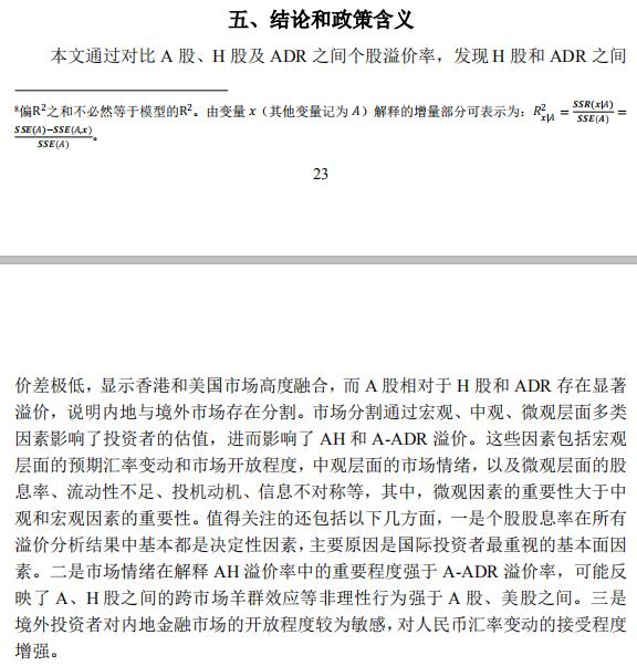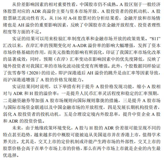论文称,未来,由于地缘政策环境变化,A 股与 H 股的 ADR 价差很可能呈现不同的特点甚至趋势,越来越多的中概股可能被迫从美国退市并在香港上市,值得学术界关注。尤其是,交叉上市的定价机制或许能产生跨市场的外部性,交叉上市的股票价格会高于在单个市场上市的价格,那么在两个市场上市就是企业的内生最优选择。