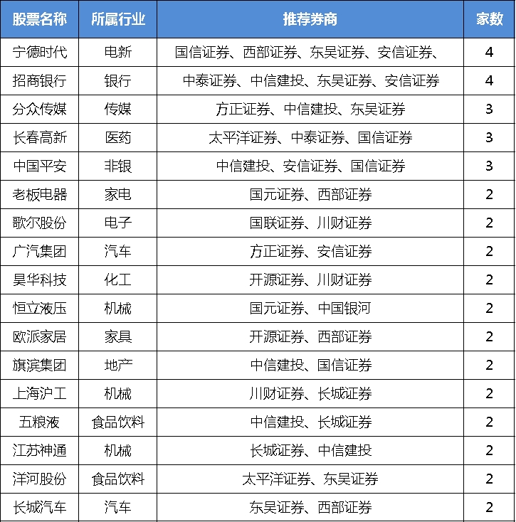 从个股上来看,宁德时代和招商银行都被四家券商集中推荐,是本月金股中最被看好的个股。