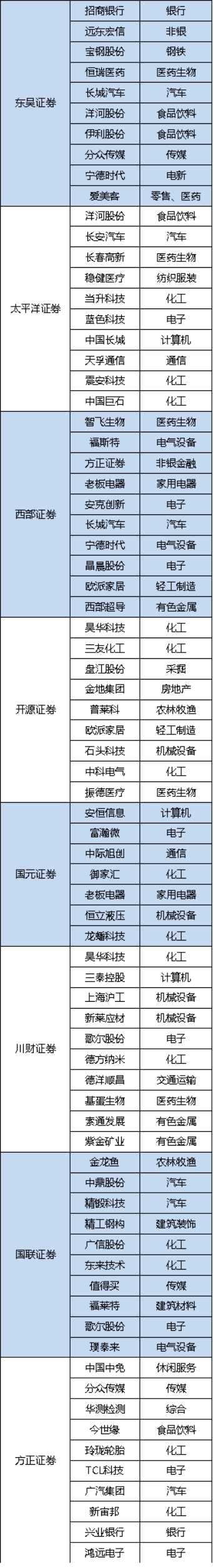 而医药生物板块中,长春高新获得了三家券商的联合推荐。金融板块中,中国平安获得了三家券商的推荐。机械板块中,恒立液压、上海沪工、江苏神通获得了两家券商的推荐。其中,老板电器、歌尔股份、昊华科技等个股也获得多家机构看好。