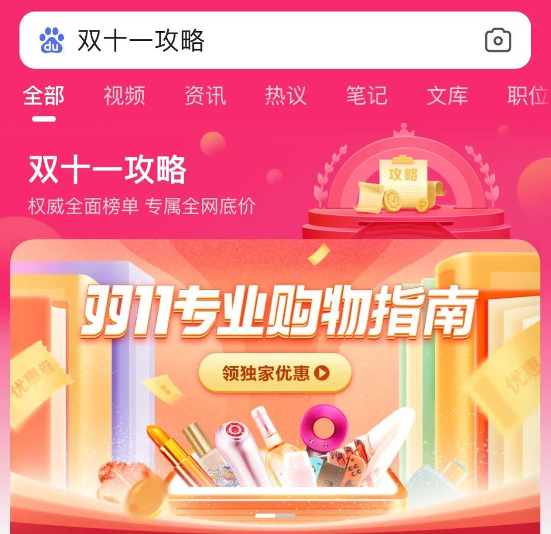 百度此次参加双十一的方式,不只是给自己卖货,也给别的电商平台「搭桥」。比如百度关键词「双十一攻略」,就会出现百度搭建的电商整合版块,版块内包含必买清单、热门榜单等,帮助用户直达好物,省掉「做功课」的时间成本以及试错成本。