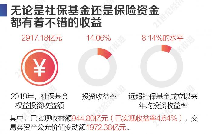 值得一提的是,无论是社保基金还是保险资金都有着不错的收益。2019年,社保基金权益投资收益额2917.18亿元,投资收益率14.06%,远超社保基金成立以来年均投资收益率8.14%的水平。其中,已实现收益额944.80亿元(已实现收益率4.64%),交易类资产公允价值变动额1972.38亿元。