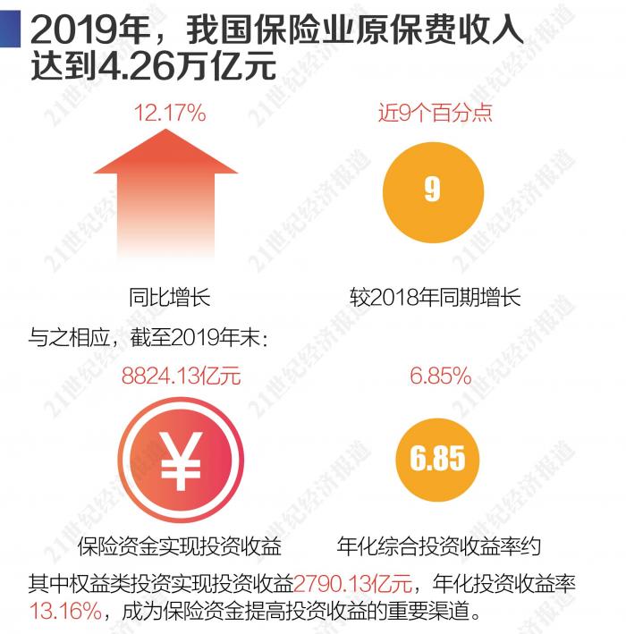 2019年,我国保险业原保费收入达到4.26万亿元,同比增长12.17%,较2018年同期增长近9个百分点。与之相应,截至2019年末,保险资金实现投资收益8824.13亿元,年化综合投资收益率约6.85%,其中权益类投资实现投资收益2790.13亿元,年化投资收益率13.16%,成为保险资金提高投资收益的重要渠道。
