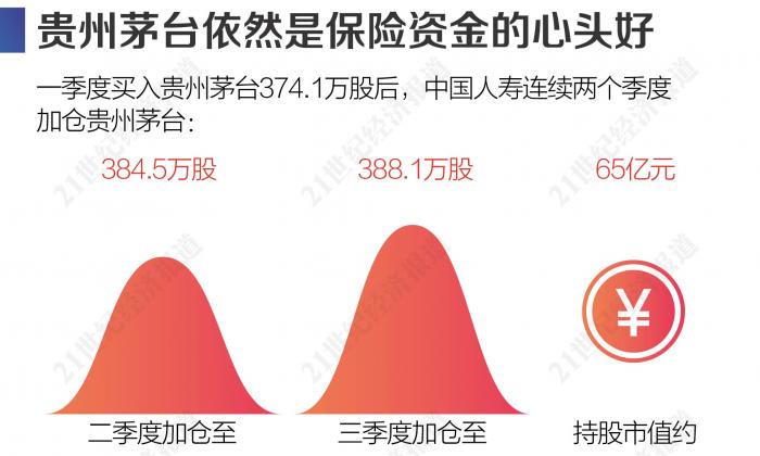 值得一提的是,贵州茅台依然是保险资金的心头好。例如,自一季度买入贵州茅台374.1万股后,中国人寿连续两个季度加仓贵州茅台,二季度加仓至384.5万股,三季度加仓至388.1万股,持股市值约65亿元。