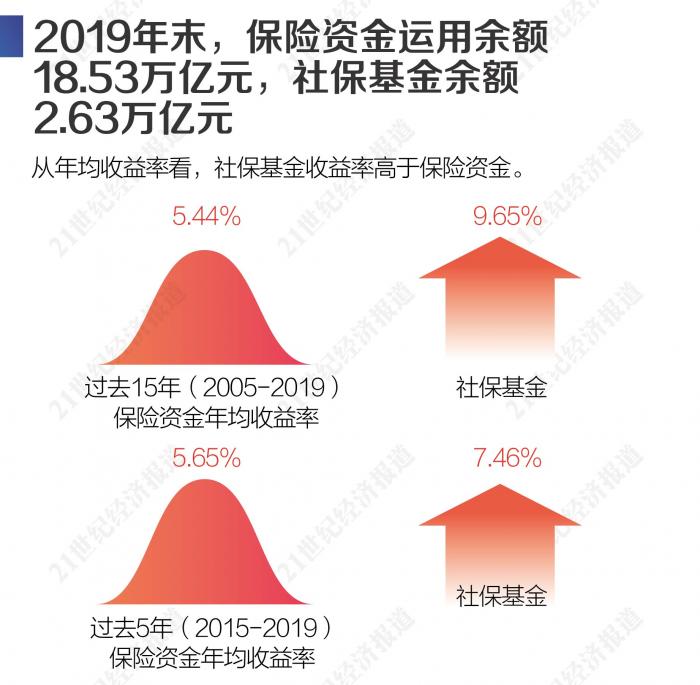 显然,社保基金的收益率比保险资金高,这与资产配置不无关系。2019年末,保险资金固定收益类资产占比67.15%,权益类资产占比23.05%,流动性资产占比4.94%。社保基金虽未披露大类资产配置比例,但政策规定的固收类与权益类资产比例约为60%、40%。换言之,保险资金的固定收益类资产、流动性资产比例显著高于社保基金,社保基金的权益类资产比例大约是保险资金的2倍。