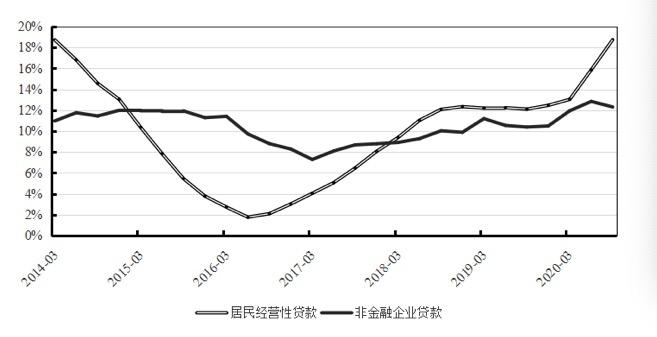 报告称,房地产交易上升直接带动居民住房按揭贷款余额的提高,同时也部分拉动了居民经营性贷款的回升。2020年前三个季度的居民中长期消费贷款增长都较快,高于2018年和2019年的增速水平,这与今年房地产市场交易活跃密切相关。同时,居民经营性贷款增速也在上升,三季度末的增速达到18.7%。与之相比,非金融企业银行贷款同比增速仅为12.3%,居民经营性贷款与非金融企业银行贷款增速之间的缺口愈发扩大。