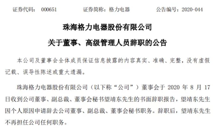 2020年8月17日,格力电器发布高管辞职公告,称收到董事、副总裁、董事会秘书望靖东的书面辞职报告,望靖东因个人原因申请辞去董事、副总裁、董事会秘书职务。辞职后,望靖东不再担任公司任何职务。