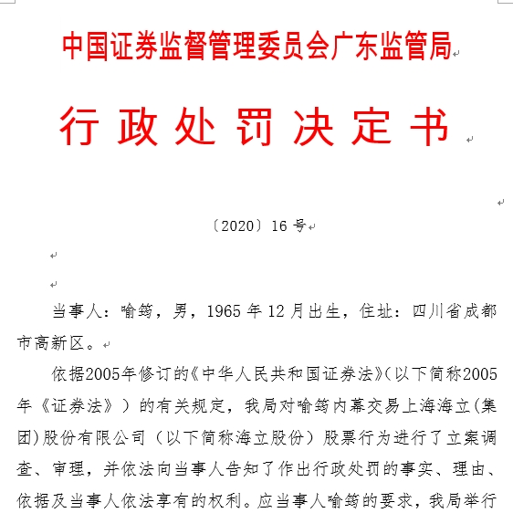 不过,当时却有人提前知道董小姐要举牌海立股份,进行内幕交易大赚一笔。广东证监局网站11月2日披露的一则行政处罚决定书显示,当时喻筠内幕交易海立股份违法所得92.2万元,对此,证监局合计罚没逾368万元。
