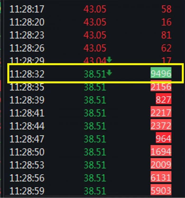 通过午间价格计算,若这9496手成交是单一账户所为,则若该账户后续没有购回筹码,则截至午间收盘该笔交易已损失约9496*100*(41.59-38.51)=292万元。
