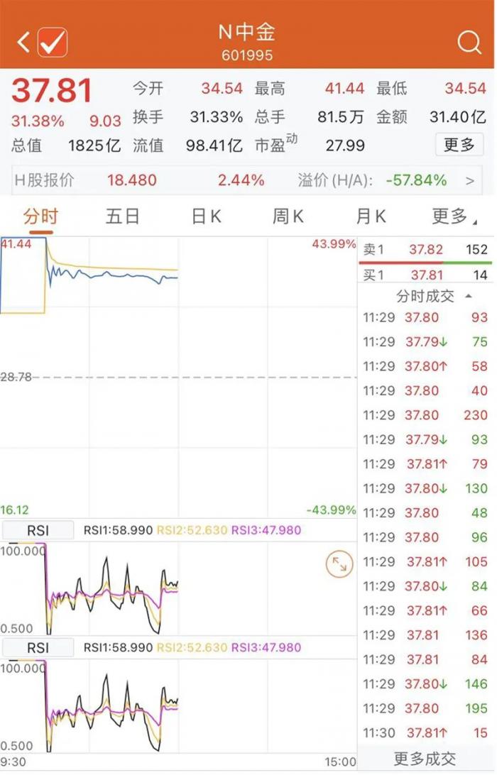 11月2日,中金公司于上交所上市交易,开盘后该股涨幅迅速扩大至43.99%,并触发临停。停牌前报41.44元每股,总市值达2000亿元。