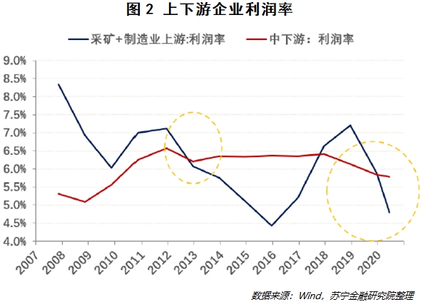 8月份之前,周期股跟随全市场一起上涨,但是并没有出现明显的超额收益,主要原因有两点:第一,PPI-CPI的剪刀差走低,这说明上游价格相较下游处于弱势,上游的利润水平不及下游(见图1);第二,疫情发生后,复工复产加快,下游需求复苏不振,经济的主要推动力是投资驱动的上游补库存,在供给扩张、需求收缩、库存去化缓慢的情况下,上游产品价格受到压制,利润率出现明显压缩(见图2),与此同时,中下游工业利润具有明显的优势。因此8月份之前,周期股难以获得明显的超额收益。