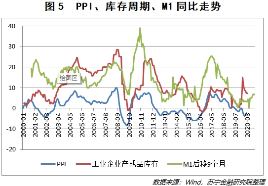 第一,从历史拟合情况来看,M1是PPI及库存周期的先行指标,领先时间一般在9-12个月左右,因此将M1同比延后9个月(见图5)后,其走势与PPI同比和工业产成品存库同比走势拟合度非常高。M1在今年1月份以来已经出现了明显的修复,故而预示着PPI及库存周期拐点有可能即将或已经出现。
