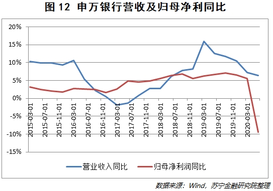 申万银行加权平均市盈率在6.6左右,在所有申万一级行业中绝对估值水平最低。在要向实体经济让利1.5万亿、监管层窗口指导的大背景下,A股主要银行中报利润率明显下滑(见图12)。上半年,上市银行营收同比增长6.4%,但归母净利润却大幅下滑9.4%,形成明显的背离。