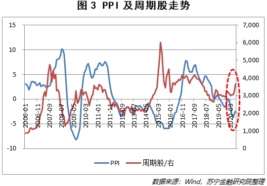 从绝对收益角度来看,周期股是否上涨的关键指标是PPI(见图3)。如果PPI拐头向上,说明上游工业品价格出现了复苏,企业利润也会随之改善,那么上游周期股就会具有一定的绝对收益。自6月份以来,PPI见底回升,周期股也在6月下旬开始出现了一轮上涨,具有明显的绝对收益。