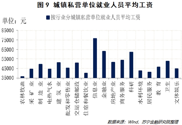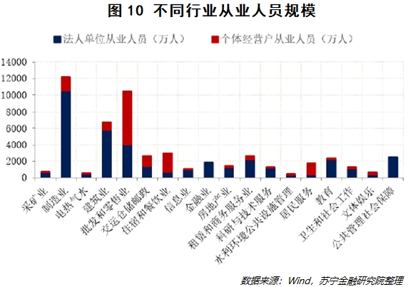 从收入结构来看(见图9、图10),除了农业,工资薪金最低的行业是餐饮、批发零售和居民服务,而这三个行业是就业规模前几的几个行业。根据第四次经济普查结果显示,中国个体经营户从业人员有1.49亿人,其中餐饮、批发零售、居民服务行业的个体经营从业人员规模达1亿人,可见低收入人群的规模非常庞大。从中国低收入人群的现状来看,受疫情的冲击,他们的收入受到了影响,那么必然会影响其支出,这又对餐饮、批发零售、居民服务等企业产生负反馈,从而形成了一个恶性循环。