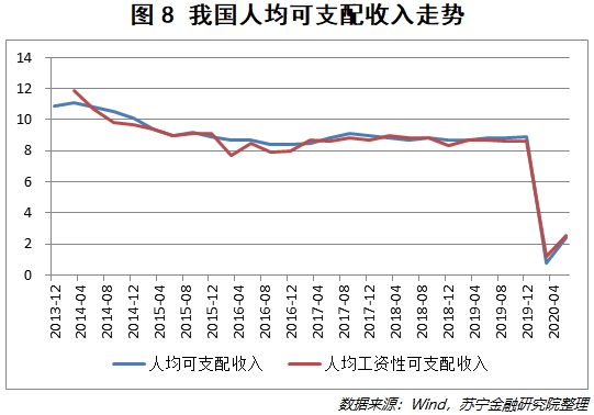 从收入水平来看,当前我国居民可支配收入出现了明显的下滑(见图8),这将极大地打击消费的意愿;随着GDP在三、四季度的逐渐修复,居民可支配收入将会逐步回升,故而低端消费能出现明显的改善最快也需要到四季度。