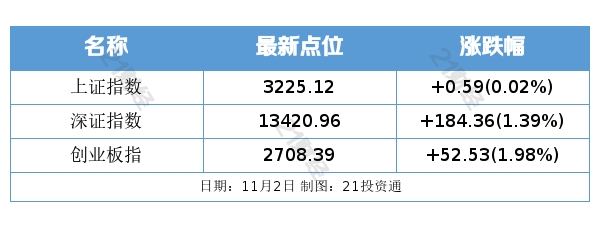 11月2日,A股大小指数分化。沪指受大金融拖累勉强收涨;创业板指数高开高走,涨近2%。